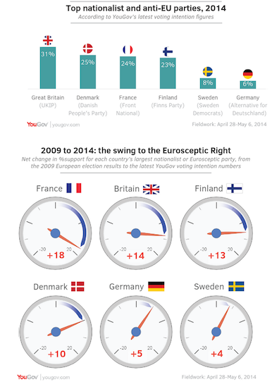 I still find it somewhat strange that the economic 'winners' of the EU and the Eurozone are the ones more likely to have anti-EU parties. I thought this from Yougovs European Parliament poll was interesting: