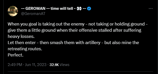 I don't want to get my hopes up but with the liberation pics and the Russian "everything is quiet" videos Legbiter shared being posted, I think a(t least one) breakthrough is happening.