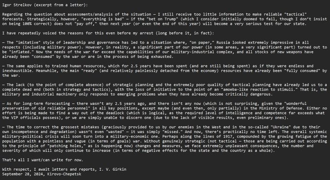 Strelkov passed a message from his Siberian prison colony. Still pessimistic...