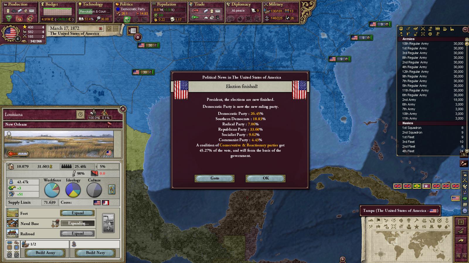The US fights a short war against Mexico for the state of Durango.  My newly reformed military makes short work of them.  I would like to build a navy but none of my capitalists want to build steamer ship yard.  In fact, nobody in the world is building them except Norway.