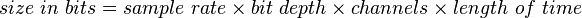 The cumulative size of a length of PCM audio data (excluding a file header or other metadata) can be calculated using the following formula: