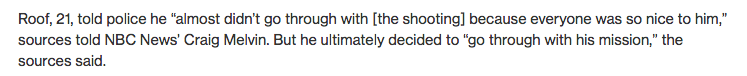 Nobody wants to hear about sympathy for murderers (especially racist ones, as this proves somehow a greater anathema still than mere murder, but I feel like I can understand this person. It bothers me people are already talking about mental illness- it's no such thing; just a murderous racist who acted on the stuff a lot of them talk about all the time. His actions shouldn't be explained away as those of the mentally ill, or anyway any more mentally ill than other fringe extremists whose ideology drives them to violence.