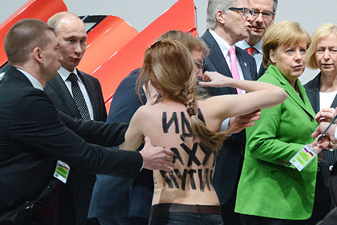 A barechested member of Femen, a radical feminist group rushes at Putin/Mekel at the Hanover trade fair: