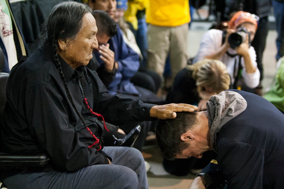Lakota spiritual leader and medicine man Chief Leonard Crow Dog and Standing Rock Sioux spokeswoman Phyllis Young were among several Native elders who spoke, thanking the veterans for standing in solidarity during the protests.