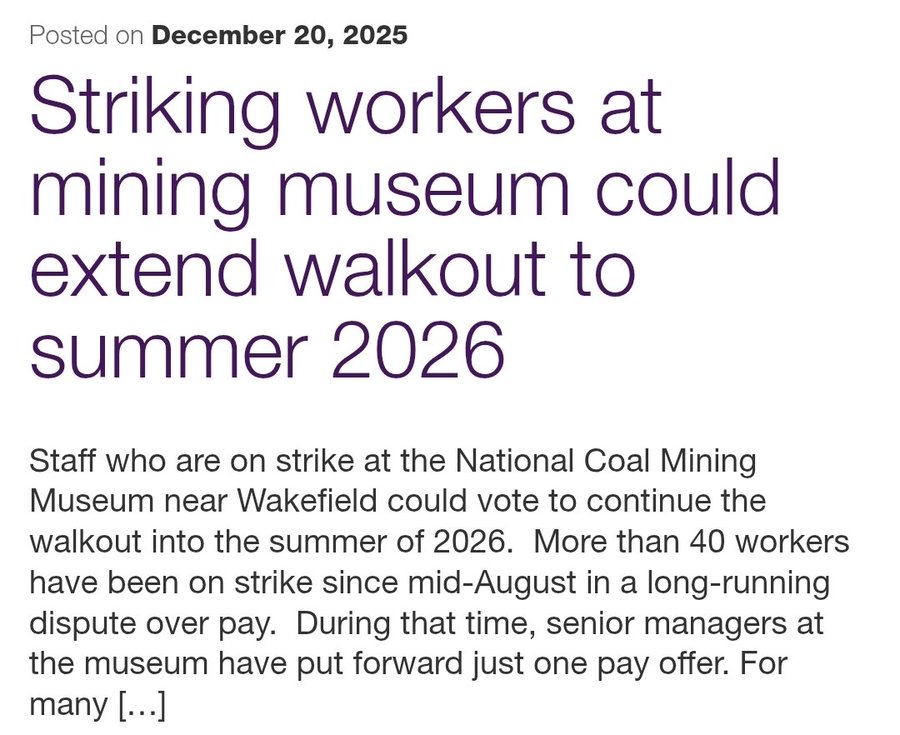 Quote from: Sheilbh on Today at 02:49:29 PMI have just discovered that workers at the National Coal Mining Museum have been on strike for more than four months and they're now balloting to keep the strike going to the summer: