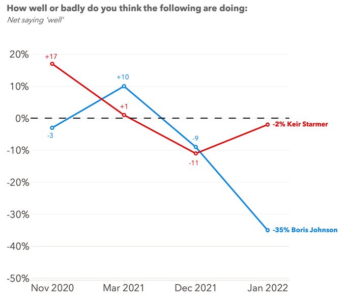 Edit: Also polling in red wall seats has Labour 10 points ahead and a huge decline in Johnson's net approval rating - and Starmer getting to neutral is an achievement that makes him one of the more popular politicians in the country: