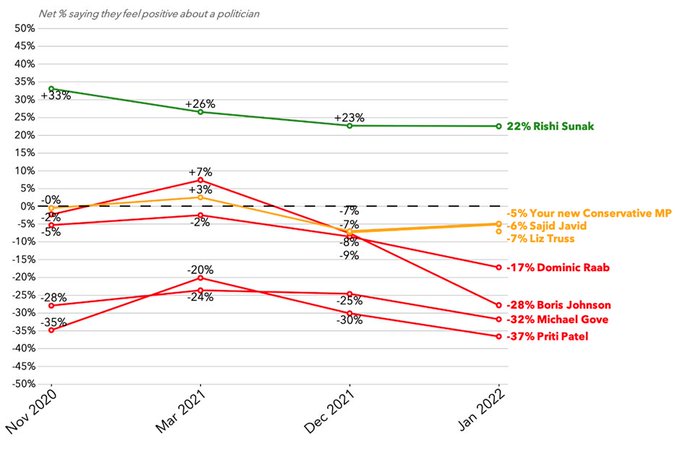 Speaking of which - Sunak's numbers are still very good. With tax rises and cost of living increases on the way - plus the impact of covid spending - I feel like that can't last for a Chancellor. It makes me think that if Sunak's ambitious, then if not now, when? :hmm: