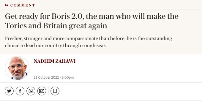 But as I say in the summer leadership Sunak said there "wasn't any disagreement" between him and Truss on Northern Ireland. So I don't really see any shift from Sunak - FWIW Baker is a very strange politician but he is very deeply devout in his faith and I think that played the big role in him not backing Johnson (and in being relatively early in calling for Johnson to go). I think this line on Johnson coming back is key in his motivation: "We can't allow it to happen. I'm not willing to lay down my integrity."