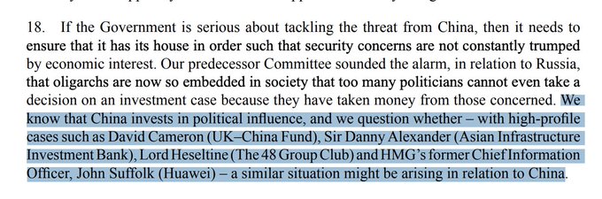 Very punchy. The intelligence committee says just as Russian oligarchs became "embedded in society", compromising UK politicians, there is a  risk of a similar situation arising with China—and to its credit the committee names names. https://isc.independent.gov.uk/wp-content/uploads/2023/07/ISC-China.pdf