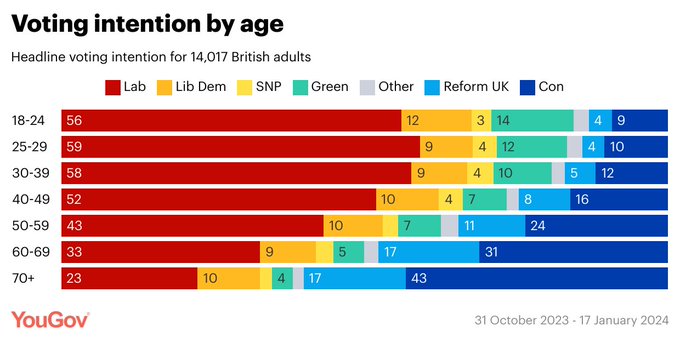 Quote from: Sheilbh on February 05, 2024, 04:55:01 PMAnd I think with Poilievre as an alternative who is winning over young voters, the Tories are facing an existential risk here (the "cross-over" age in the 2019 election was, I think, 37 and, I think in the 2010 election the Tories won a plurality of every age group over 24):