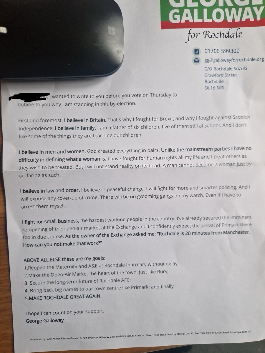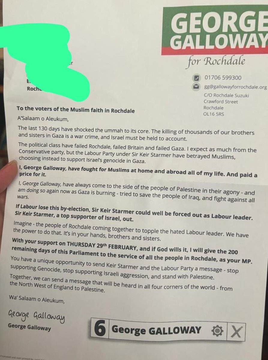 Rochdale election tonight. George Galloway, of the Workers Party of Great Britain has been endorsed by Nick Griffin or the BNP. Proving that he's a one man red-brown alliance, Galloway's campaign has been sending these two letters, I assume to different intended audiences: