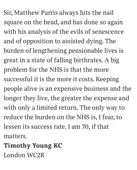 And not unrelatedly a letter in the Sunday Times on Parris' piece. As I say, I don't think we can pretend this isn't a risk in this country. Also I find this language "a limited return", "reduce the burden" like Parris' "units" with input and output concerning - and why I think even from a secularist perspective insisting on the value, worth and dignity of every single individual is so important: