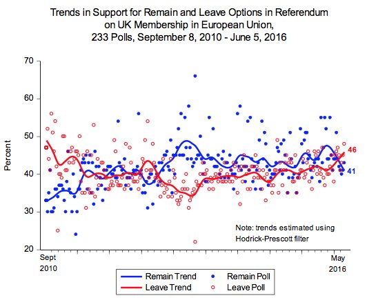 I expect Remain to win the vote in the end, something like 52-48. Although it's looking good for Leave right now, voters tend to go for the status quo in the last week or so.