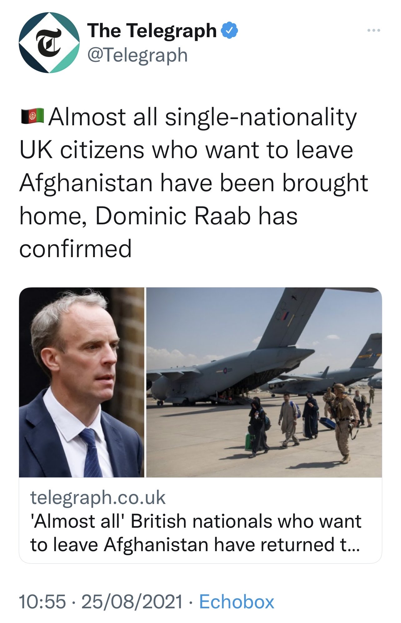 The question that no one seems to be asking is why we have any obligation to get these people out. I can't speak to the UK but the US government gave ample warning months ago that we were pulling out and advised citizens to leave. Military or government workers in the country--I get that we have an obligation to get them out. Private citizens on the other hand...