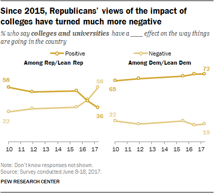 Apparently a majority of Republicans believe that universities have a negative impact int he wellbeing of the US. This opinion has risen sharply in recent years, as back in 2015 they still had an overall positive opinion of them. This anti-intellectualism thing is getting out of hand, it seems...