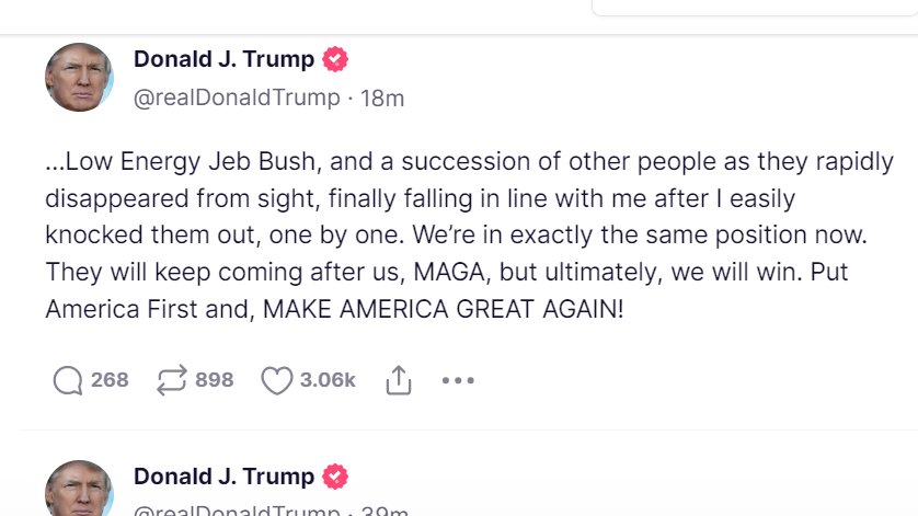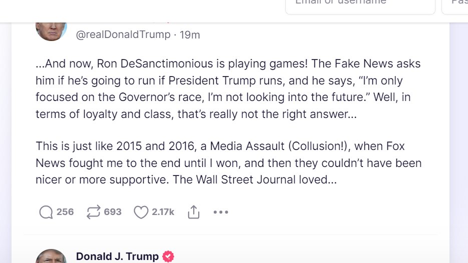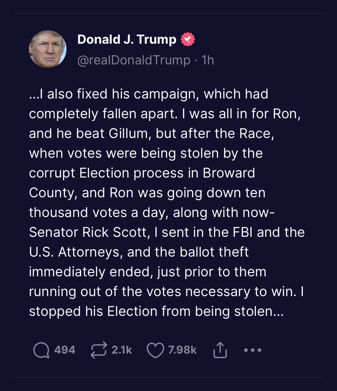 So, as expected, Trump has started the GOP on GOP political violence campaign against DeSantis by ranting about how ungrateful DeSantis is after all the help he gave him, and seems to imply that he actually rigged the Florida 2018 gubernatorial election (which was extremely close) for DeSantis during the vote counting process.