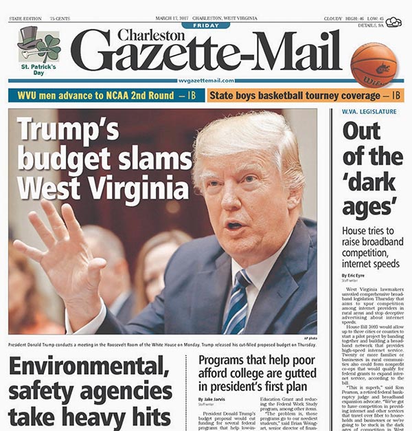 As we noted yesterday, much in Trump's budget hits poor rural voters very hard. West Virginia is a poor rural state and the Charleston Gazette-Mail, the largest newspaper in the state, noticed. The article cites many of the things the Appalachian Regional Commission has done for the state, including strengthening the infrastructure (transportation, broadband, water, and sewer projects), training people in entrepreneurship, building community health centers, and more. Trump's budget defunds the Commission and the paper is not pleased. What he sees as waste, it sees as vital services. This is a simple reminder of why it is so hard to change the federal budget: every single item that is in there is present because some senators and representatives want it in there. If other newspapers and media outlets in the heart of Trump country also start attacking him, at the very least it will put pressure on senators and representatives to fight him. (V)
