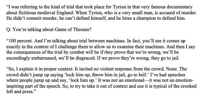 Quote from Rudy when questioned about his call for "trial by combat" at that rally :huh: :blink: