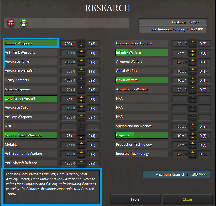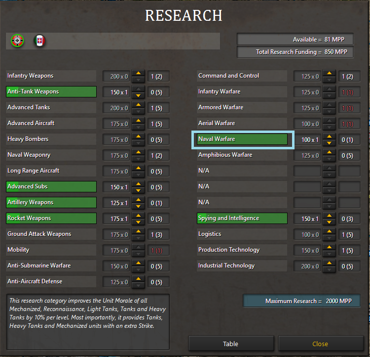Italy can now beginning researching more advanced Infantry Weapons, although those are active Technologies: This means I will have to spend MPPs to upgrade each unit individually when the time comes.