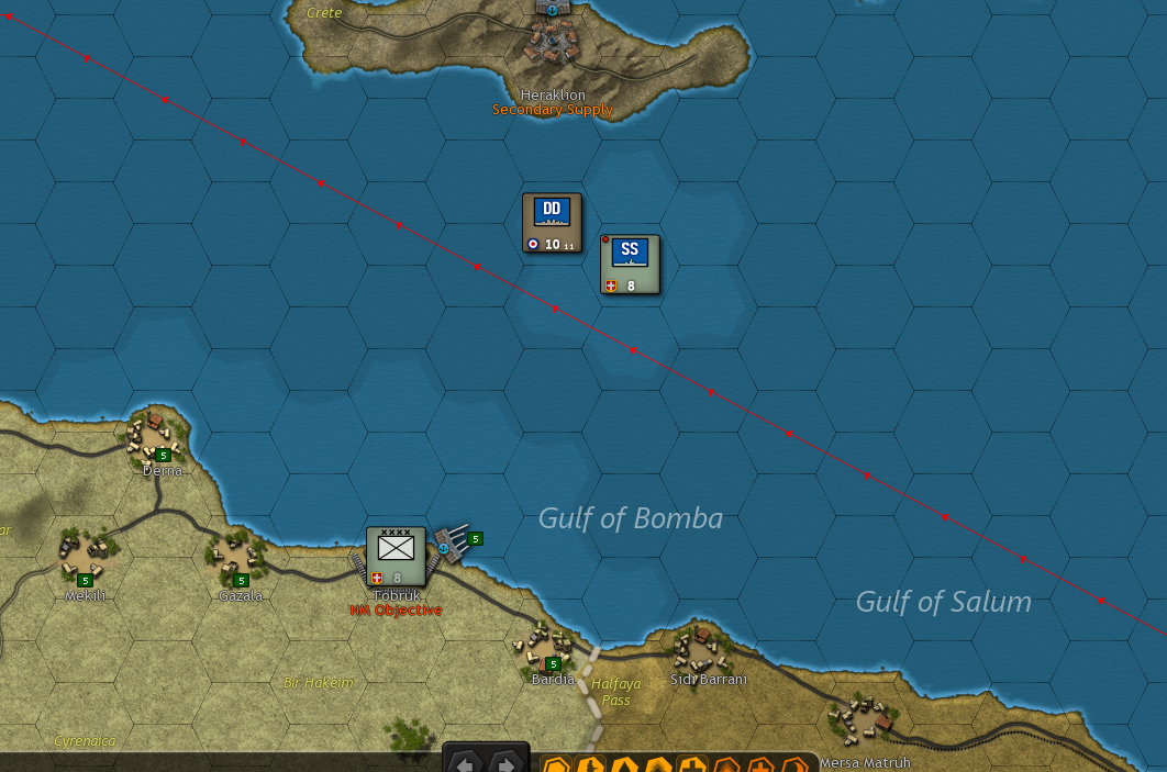 Absolutely nothing of note on the Allies turn - except a contact with a Mohawk-class Destroyer rushing westwards, north of Tobruk, that was sighted by our neutral Italian submarine. Where the hell is the Royal Navy? Are they on strike? Was Churchill kidnapped by a pack old, sex-crazed spinsters?