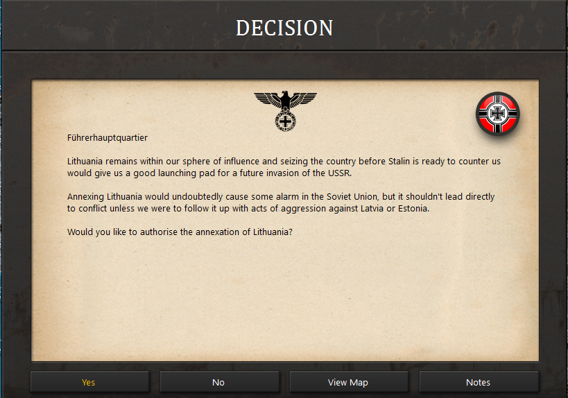The first, as expected, is the option to annex Lithuania next Turn, right under Stalin's nose. It takes me five microseconds to say Ja!, because Russian mobilization is so low currently that even a 10% jump is not that scary right now.