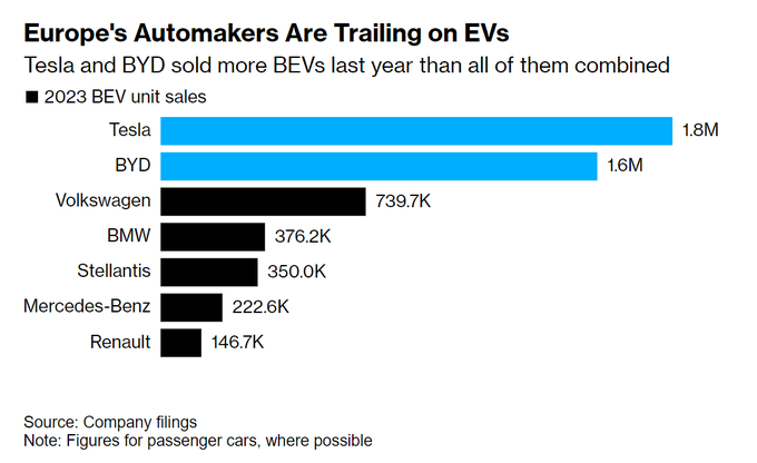 From Bloomberg report that European car manufacturers considering some form of tie-up/cooperation ("an Airbus of autos") to face US (Tesla) and Chinese (BYD) competition.