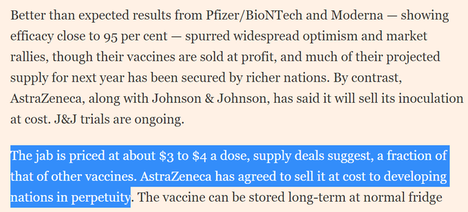 The AstraZeneca/Oxford vaccine does not need cooling, costs $4 a shot and they plan to make up to five billion doses next year, but need two per patient. A real game changer not just for the richest countries.