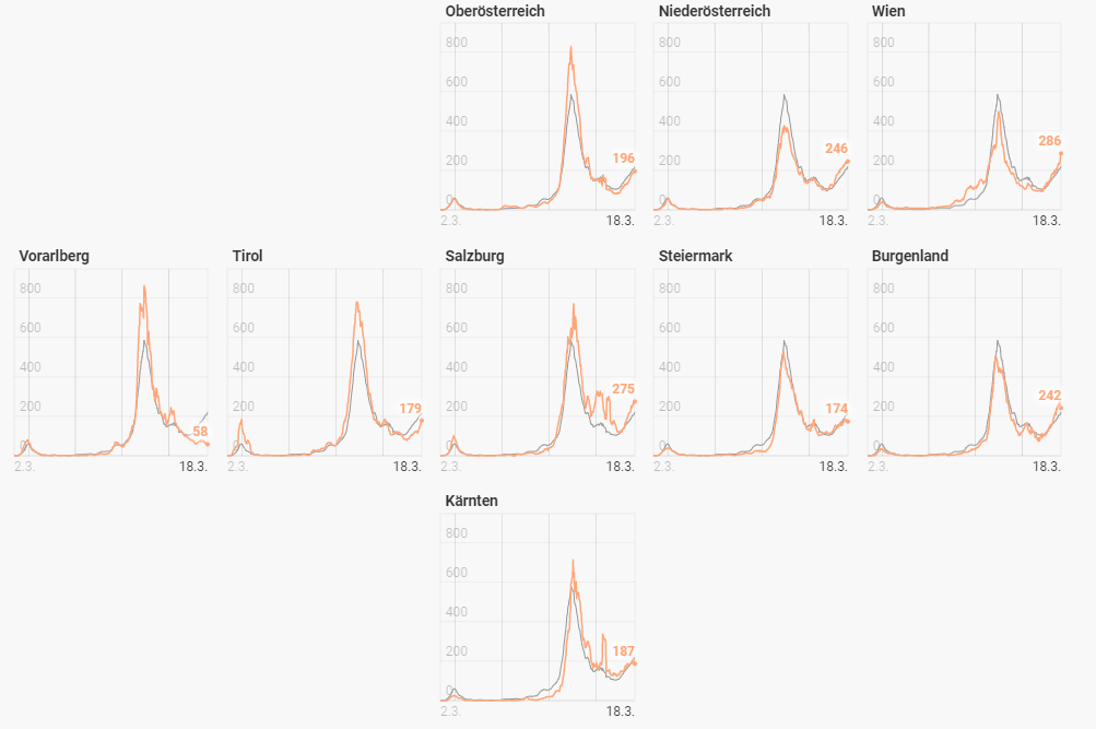 7 day rolling average of new cases in Austria per 100k per state (the layout is roughly geographical in case you wonder).