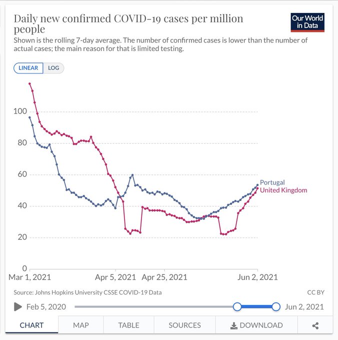 Why Portugal in particular? What I wonder is why they set up this traffic light system in the first place when the only greenlit country of any interest for UK summer travel is backtracked at the earliest opportunity for the flimsiest reason. It's pretty ridiculous to set up such a system if the only greenlit options are either remote colonial outposts or countries that don't allow UK visitors themselves (you'd assume that reciprocity would be in place). I think that it's only Israel and Iceland left in the green list that are proper travel destinations, IIRC.