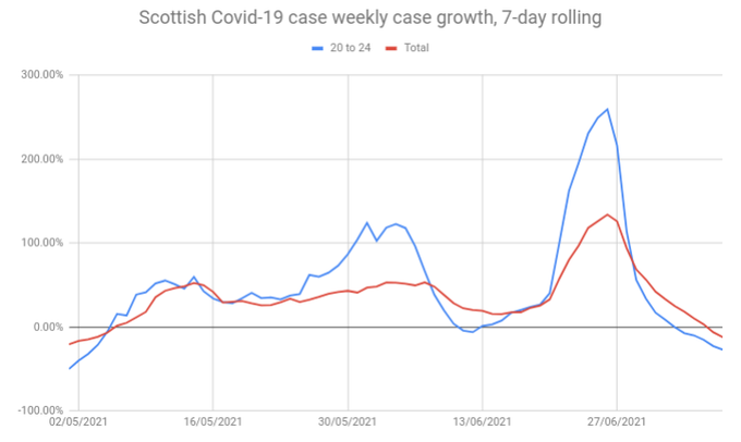 Scotland's first Euros game was on 14 June, they played England on 18 June and their last game on 22 June. I imagine testing happens a few days after infection so I wonder if it is linked - also I think UK public health authorities have said that current cases are, on an adjusted basis, 30% more male who are probably more likely to be gathering to watch the Euros especially for younger men.