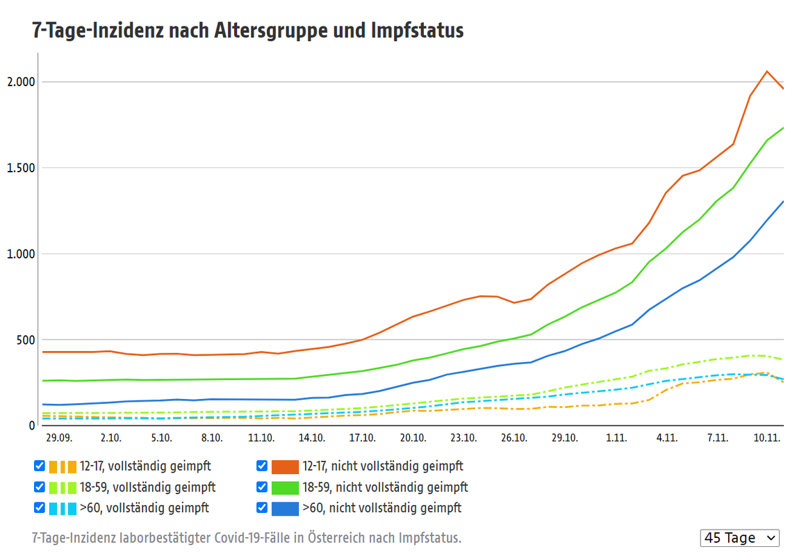 And this bears out in the 7 day incidence per 100k by state. Salzburg and Upper Austria have notably lower vaccination rates. Vienna has had stricter measures for a while, with other states only slowly doing the same.