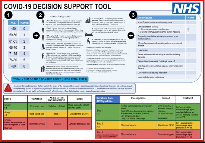 Clinical judgement is still key but this is used to provide a structure for the decisions by doctors. They emphasise it's just a tool/outline but if there's someone who's over 80s but in good nick they're not going to necessarily follow this. They asked doctors if this was about lack of resource, best medical treatment or if they're likely to make it. Apparently their view is it's a bit of all three. Because there's no cure people don't go to ICU to get treated, they go to ICU because they might need/will get more aggressive organ support and ventilation so they can fight off the virus. So part of it is just about assessing who is most able to fight this off and what's the benefit to an individual who is likely to be able to fight it off to spending their last days intubated etc. It is a bit callous - but doctors are, they're all psychopaths as far as I can see - but I always kind of admire medics for really thinking about the ethics of this and how to make the worst decisions.