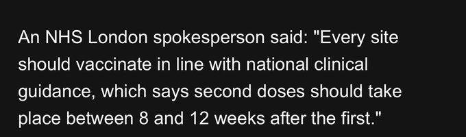 A statement from NHS London which doesn't engage with what's actually happened this morning. So despite what friends/family might have got previously or indeed what councils themselves have been advertising, again it's now no second jab pre 8 weeks.