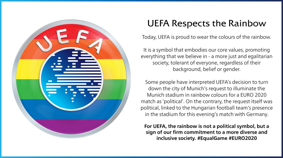 Also love the various German stadiums lighting up in rainbows tonight - as well as Griezmann or the Swedish coach commenting on it. A number of clubs (I would note that at least a few are still technically in the Super League so may just enjoy the chance to tweak UEFA) have also made statements/solidarity.  I think UEFA and clubs and football authorities generally underestimate the power of the people who participate in the game on some of these issues. On all the English podcasts/Twitter everyone has suggested that the Allianz Arena should do it anyway and set up a GoFundMe for the fine (which, based on the fines for racism, would be quite small anyway).