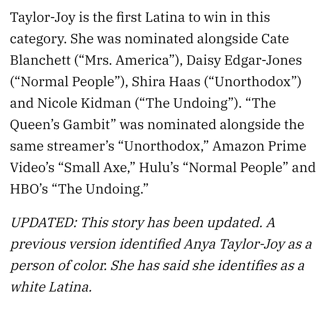 Anya Taylor-Joy (Queen's Gambit), "woman of color".