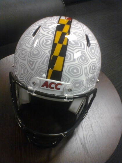 The helmets invoke the state with a stripe down the middle depicting the Maryland flag in a reduced, repeating pattern.