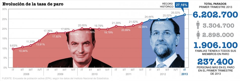 Meanwhile, in Orwellian Spain, our beloved leaders are congratulating themselves for curbing unemployment the day a new record is reached. We're up to 27.16% unemployment (not counting "students"). Almost 2 million families have no breadwinner.