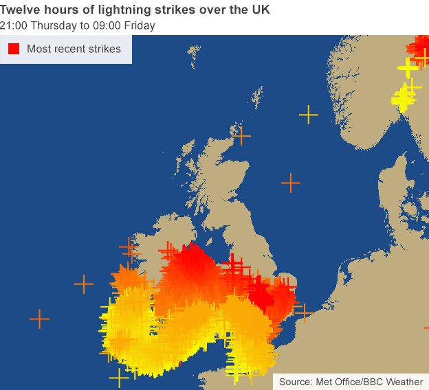 Storms hit southern England overnight, and BBC Weather said the rain would move north across the UK during Friday.