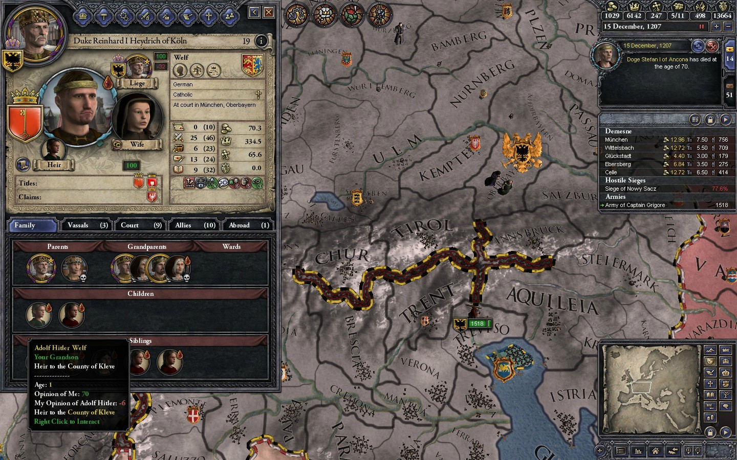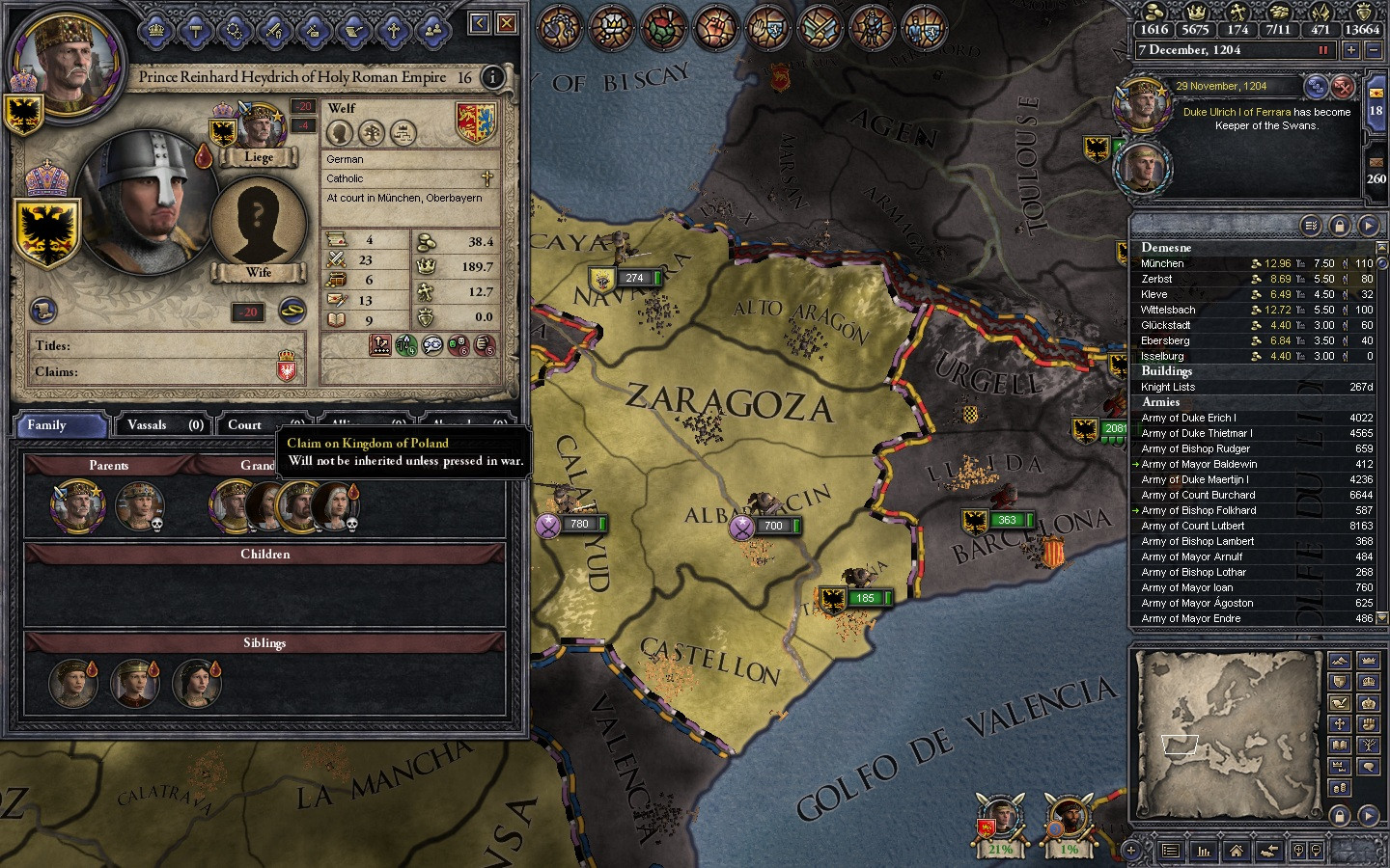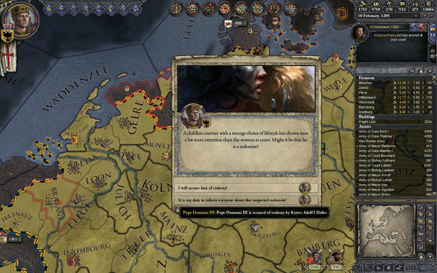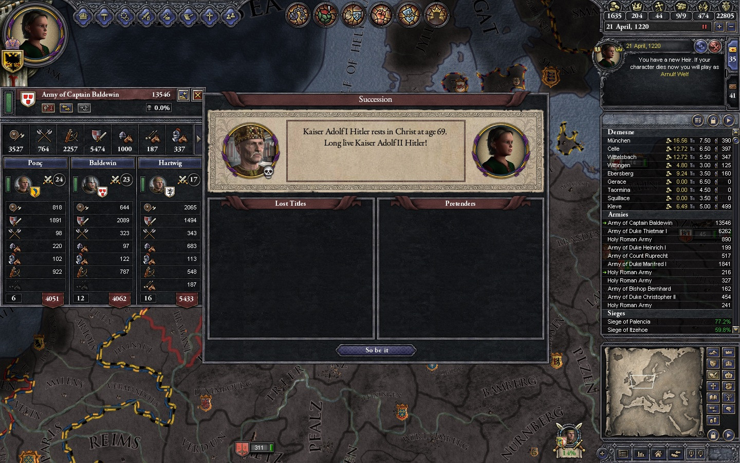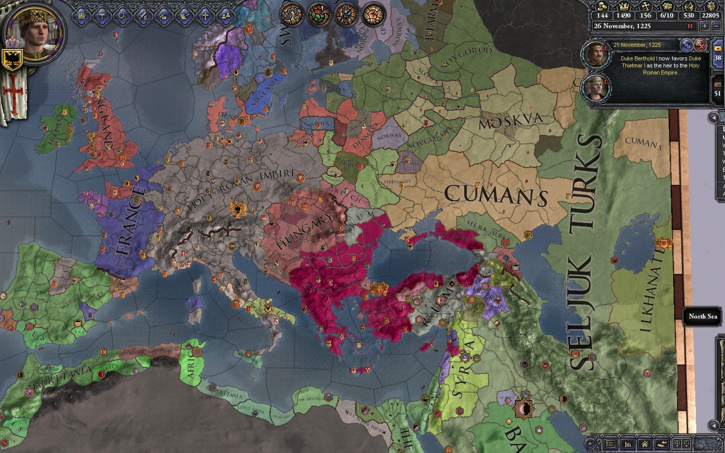 Most of Spain has fallen to the darkies. Only Kaiser Adolf's intervention saved the Duchy of Barcelona. Scotland is gone, and some of France's duchies joined the HRE in respect to Kaiser Adolf's kindness to them. Russia is a mess, but the HRE doesn't give a shit. Sicily was hit hard by the darkies, but Southern Italy was saved and incorporated into the HRE under a Welf duke. Denmark is run by the Brother-in-law of the kaiser.