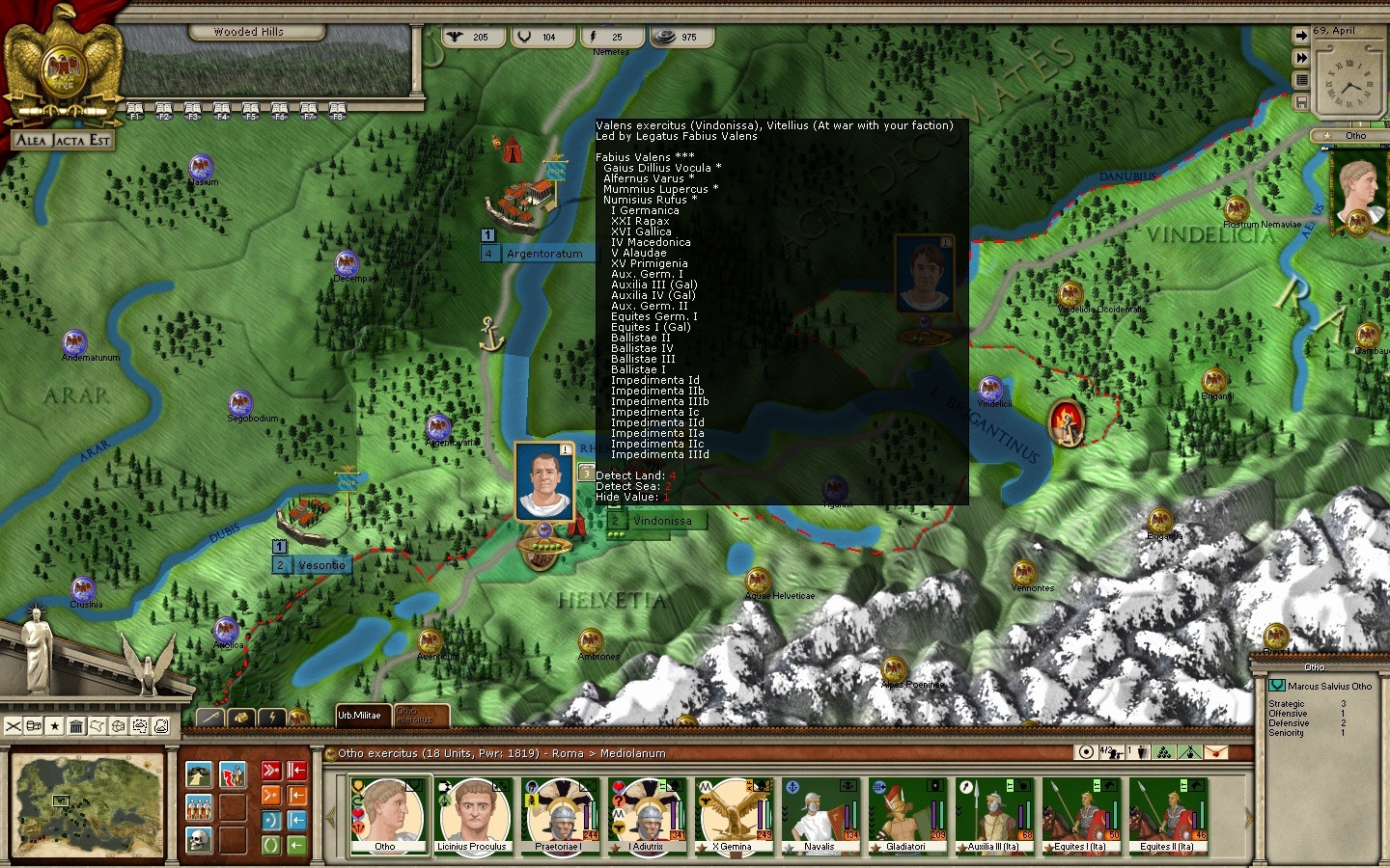 I lose track of the turns and Otho is trapped in Gaul by the snows. Handsome shows up with a legion shadowing Otho. Meanwhile, a third scratch force is formed in Milan.