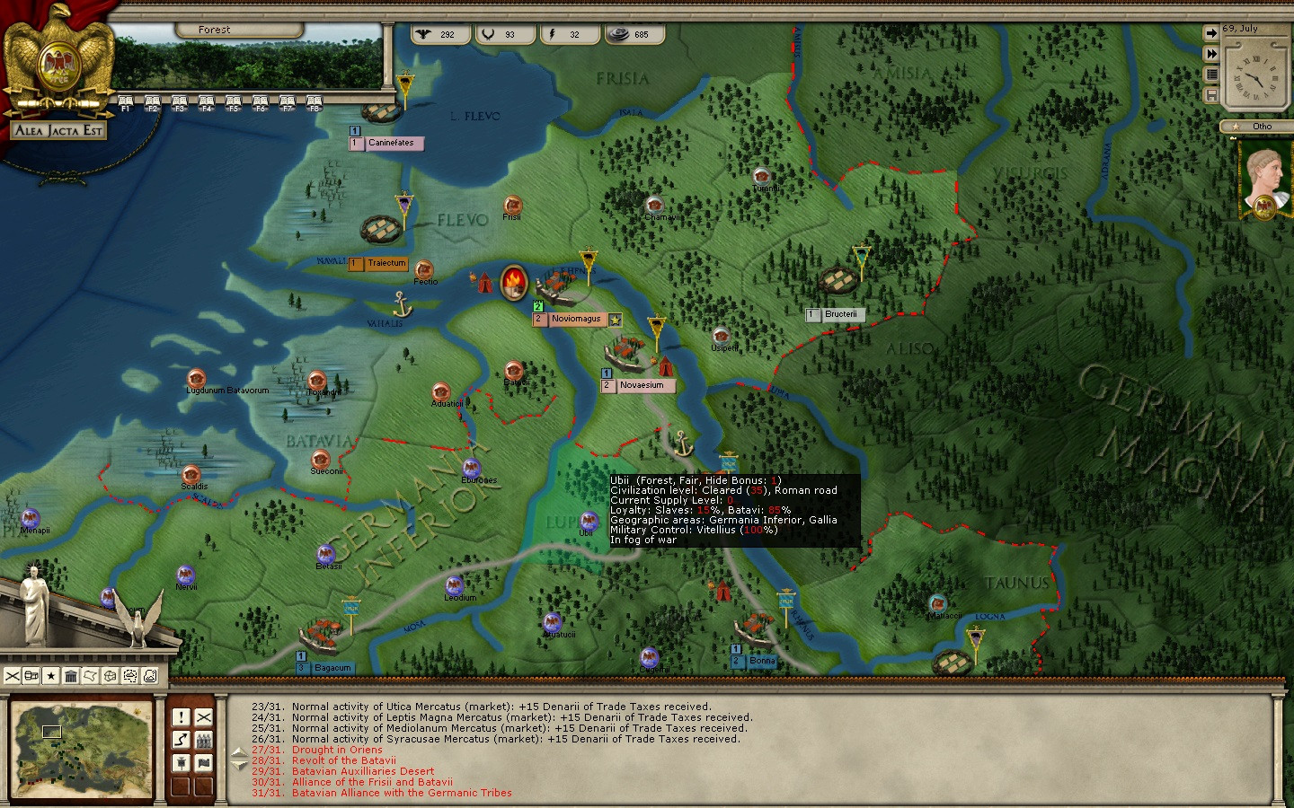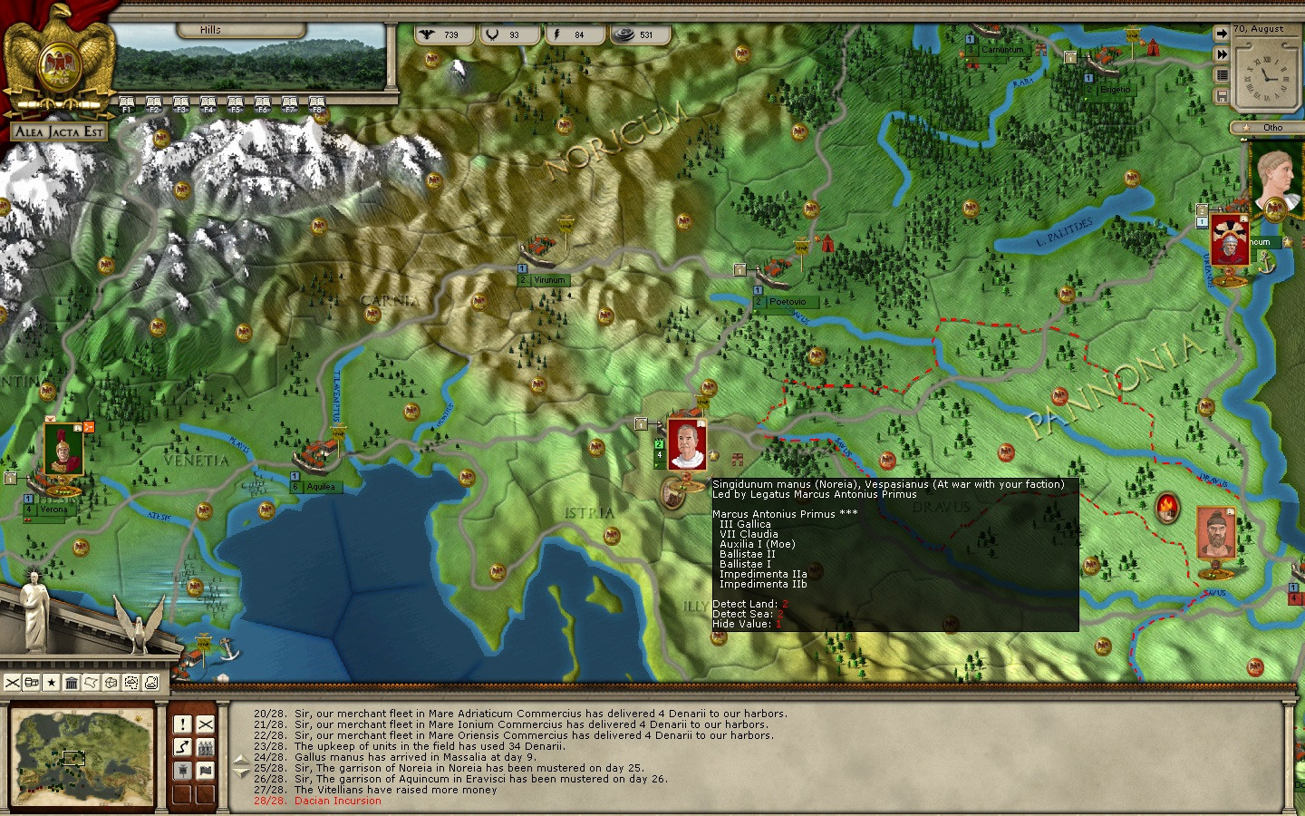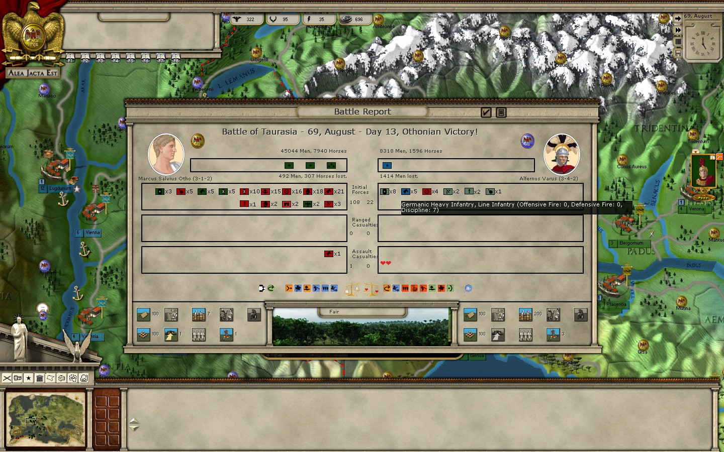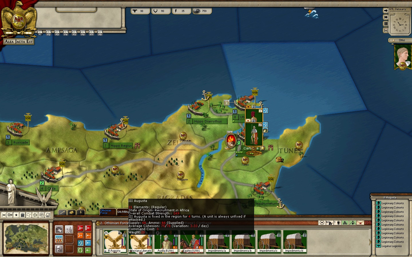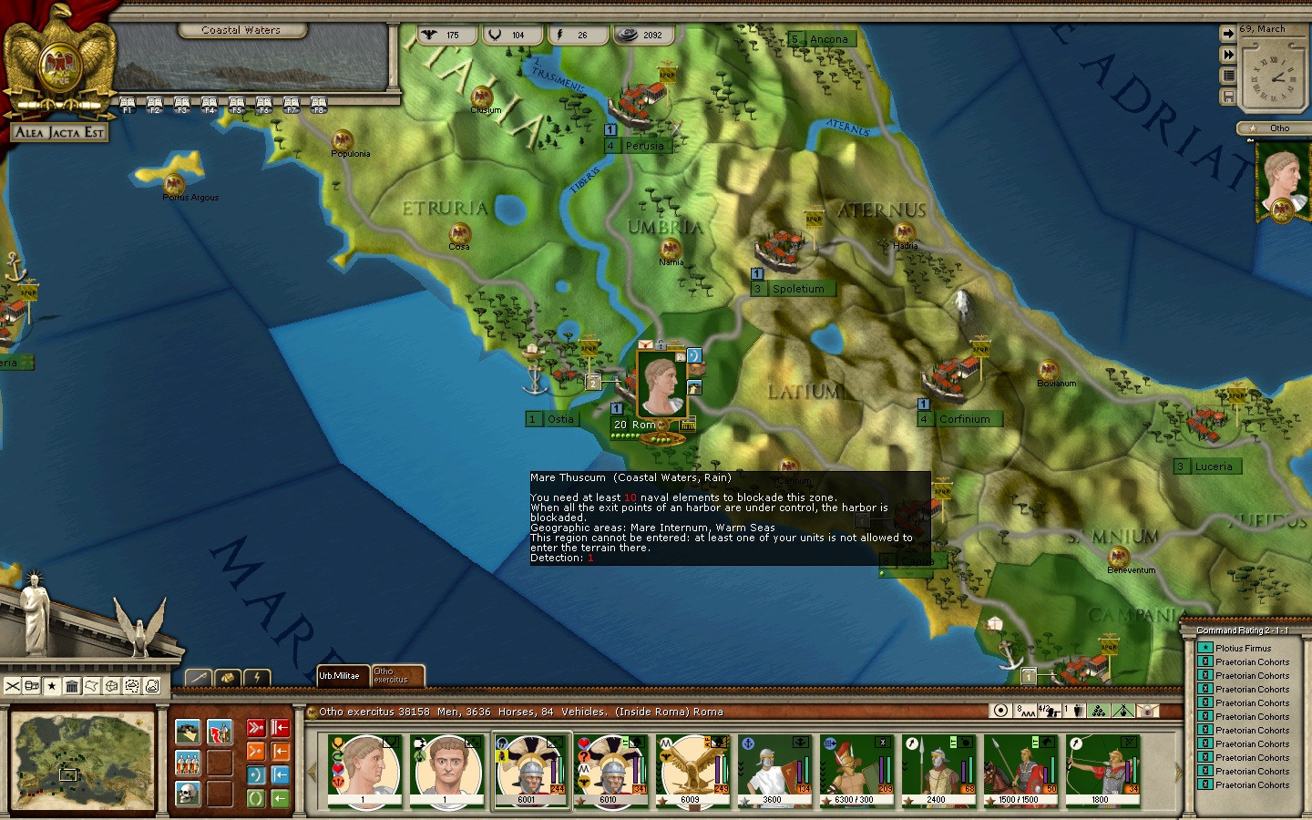 Meanwhile, I move Otho to Milan to link up with some called up Auxiliaries and Cav. A Depot is built to support the army. Gaius Suetonius Paulinus will form another force at Verona with the Pannonian Legion, 2 units of Marines(about 12 cohorts worth) and a bunch of odds and ends scraped up.