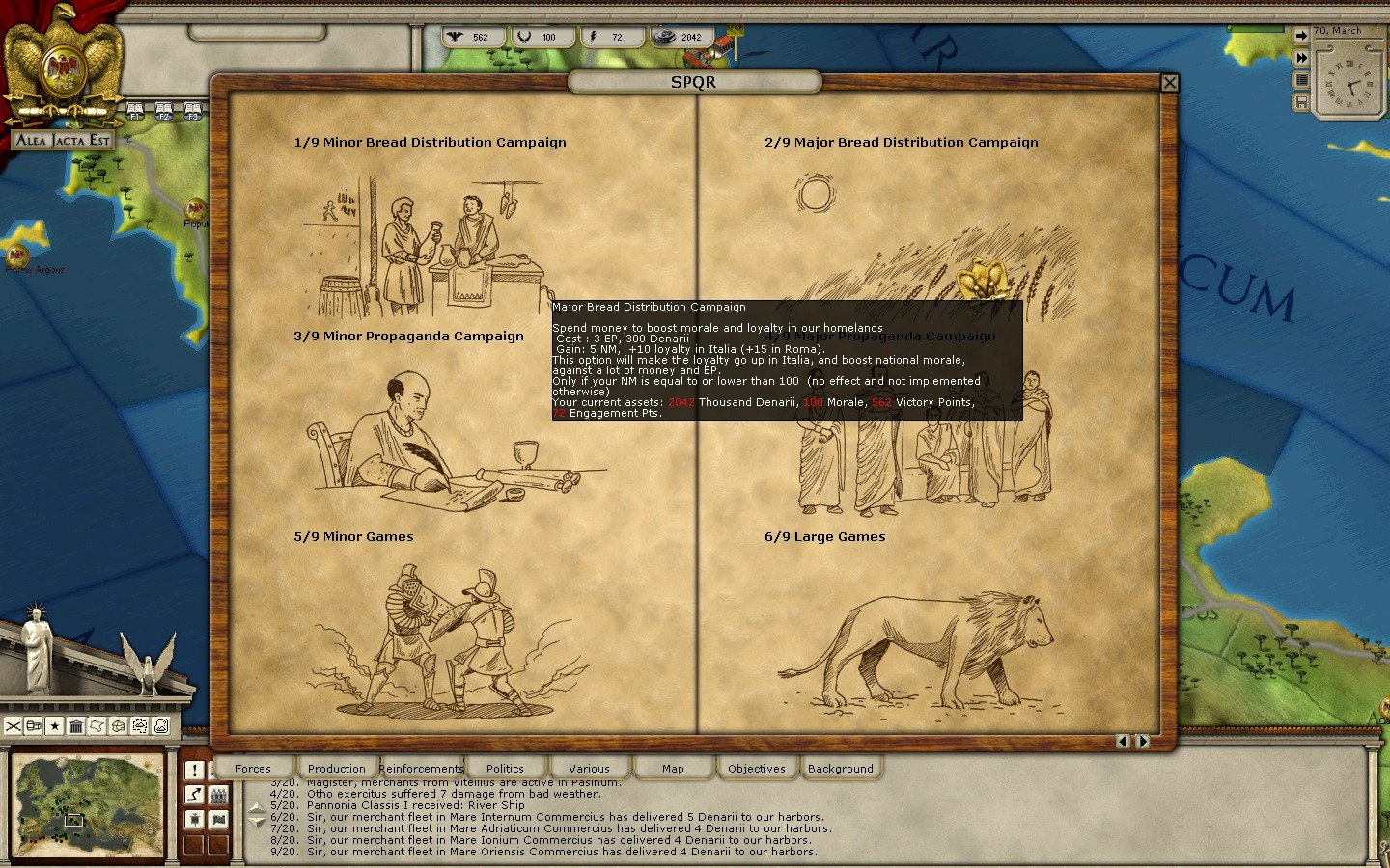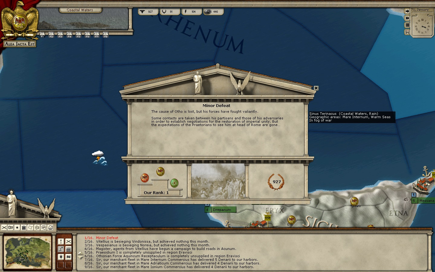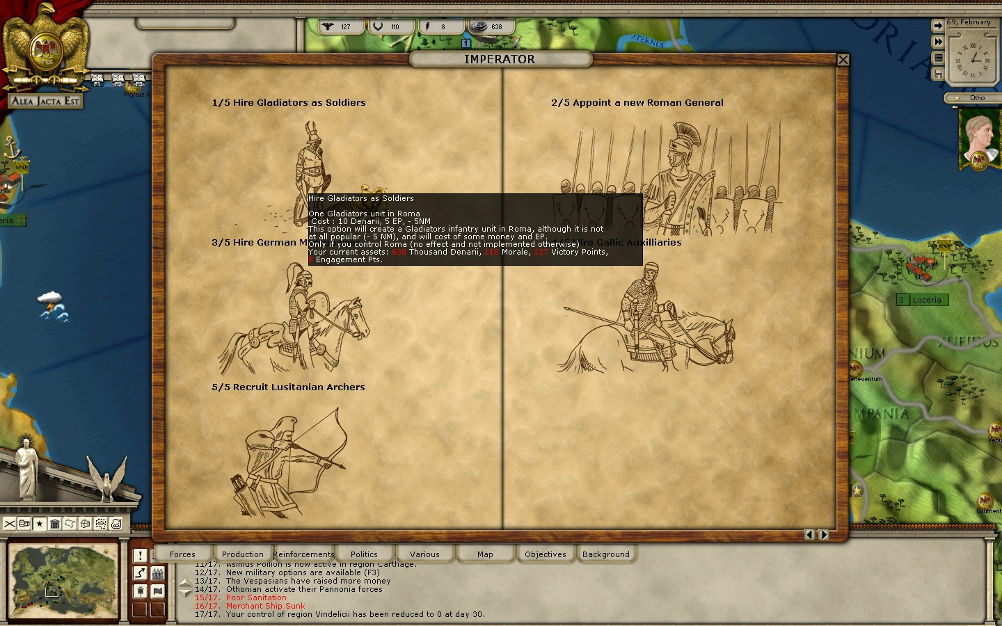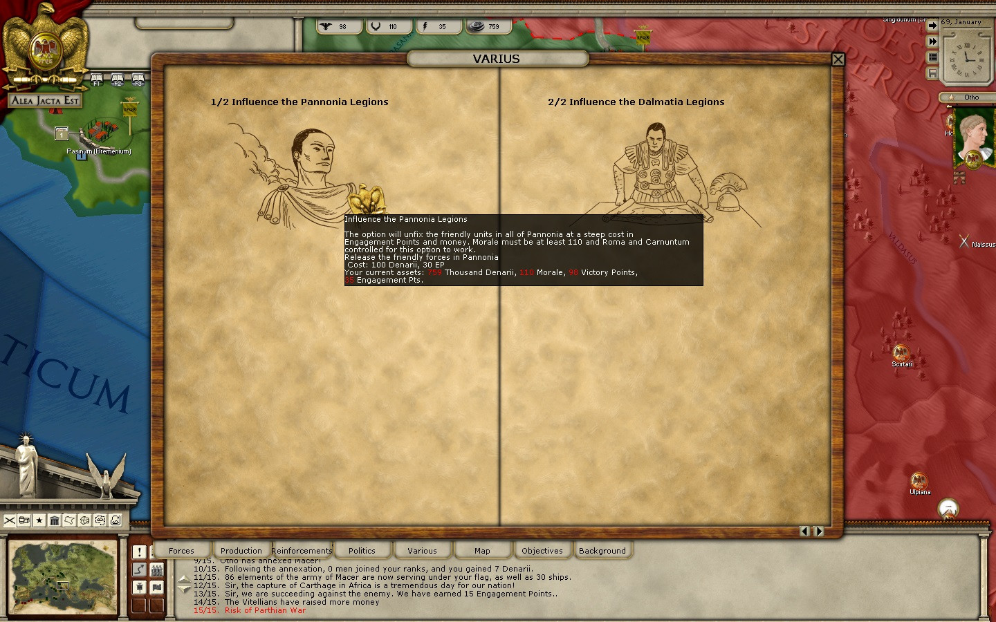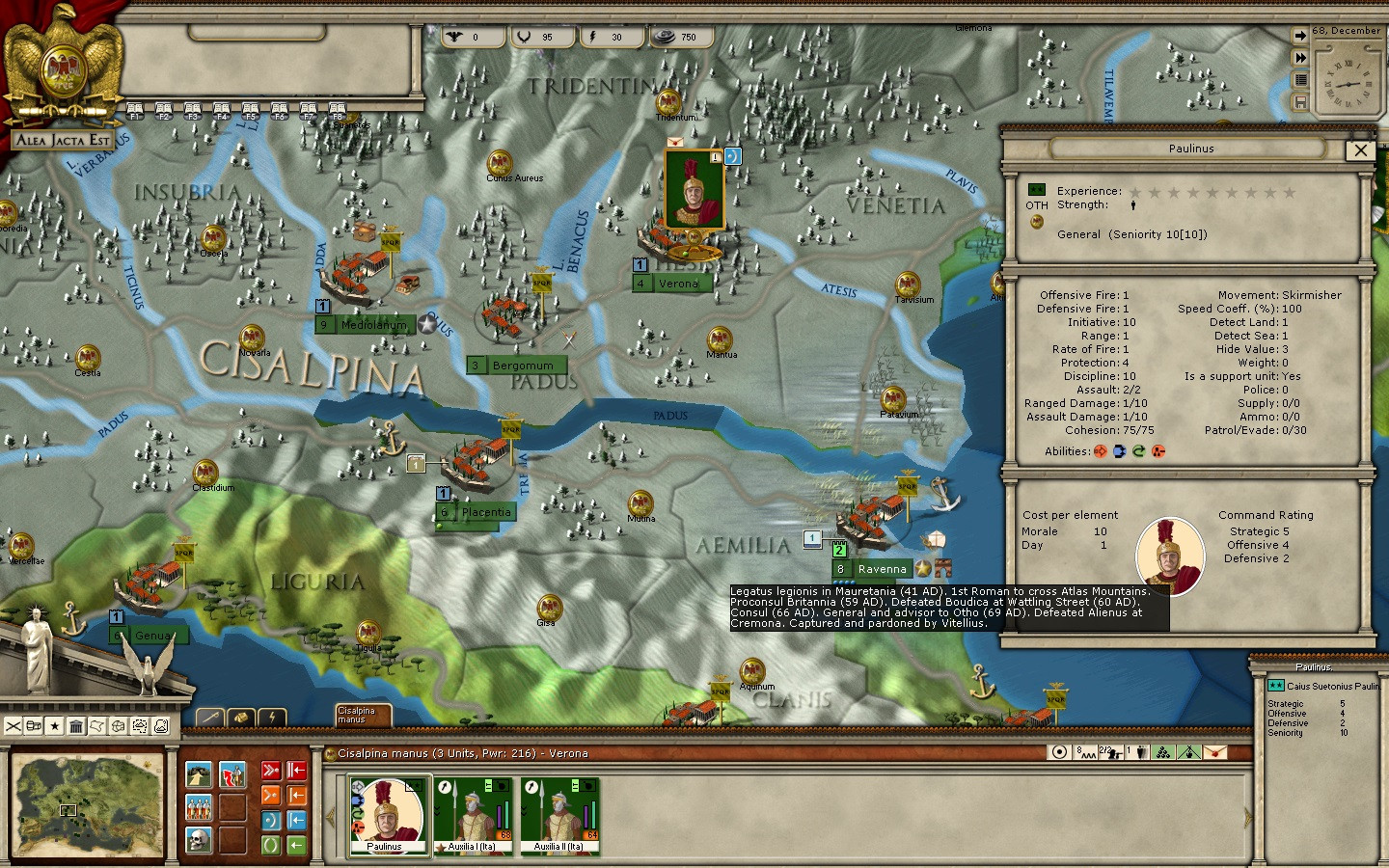 Meanwhile, I move Otho to Milan to link up with some called up Auxiliaries and Cav. A Depot is built to support the army. Gaius Suetonius Paulinus will form another force at Verona with the Pannonian Legion, 2 units of Marines(about 12 cohorts worth) and a bunch of odds and ends scraped up.