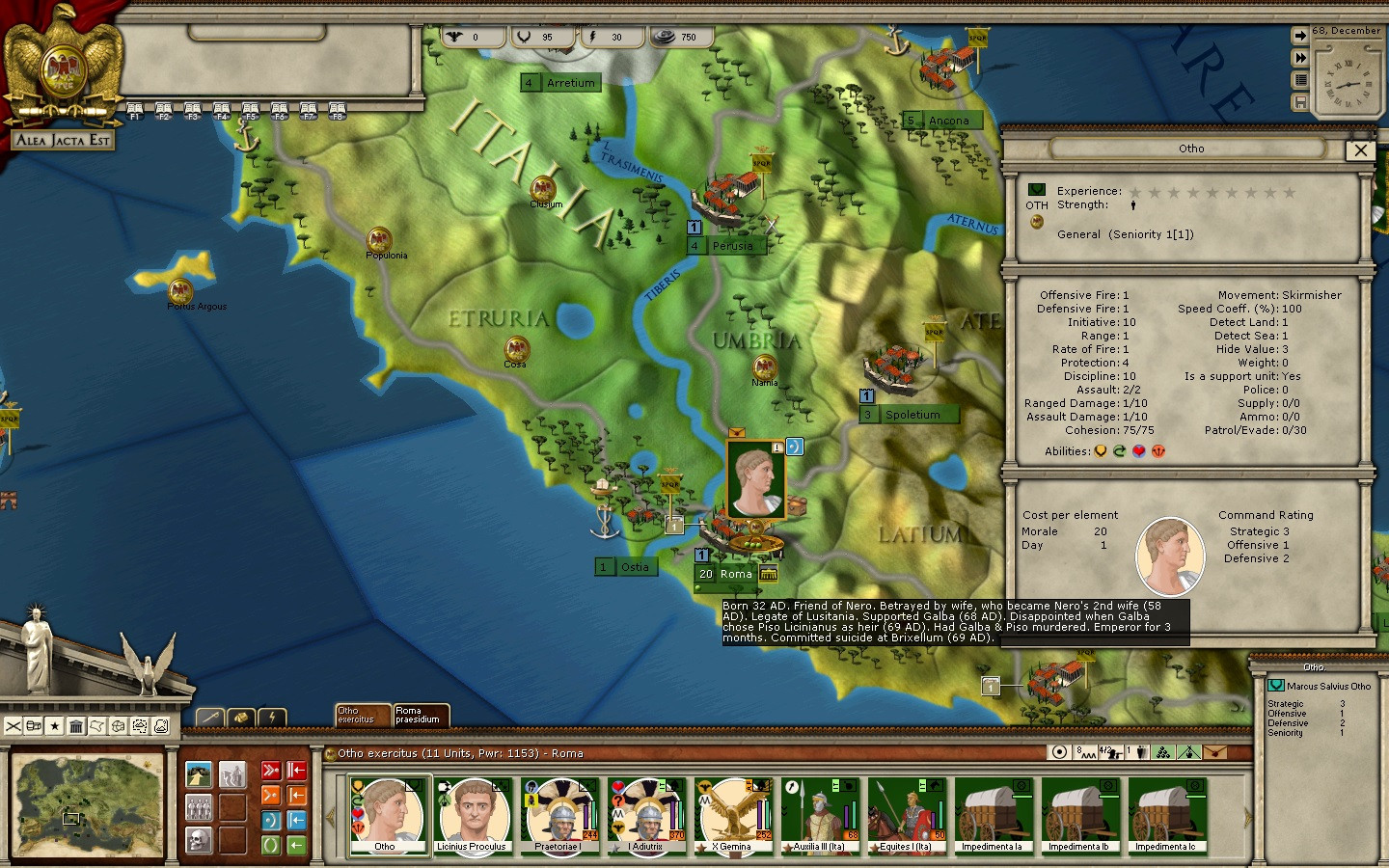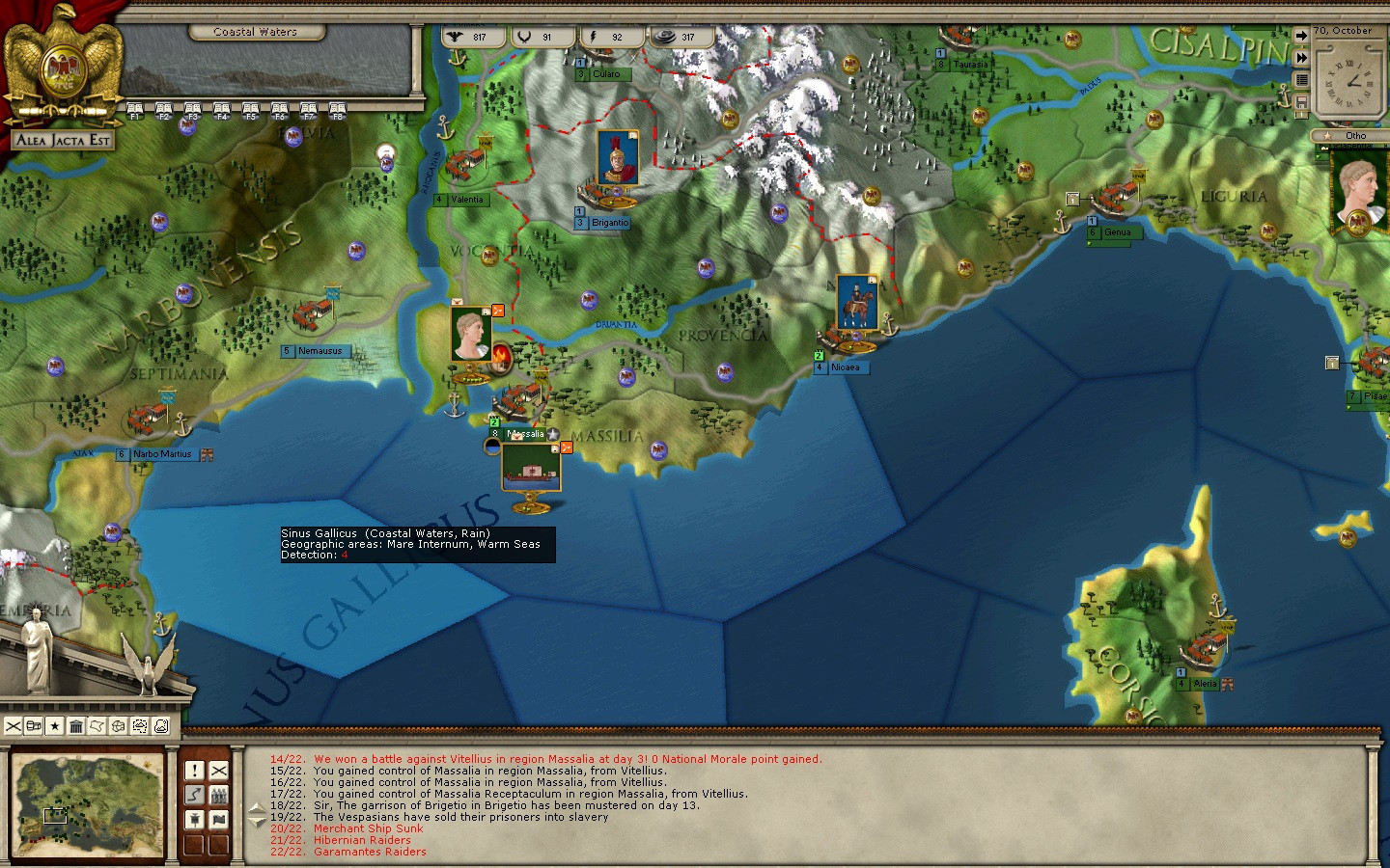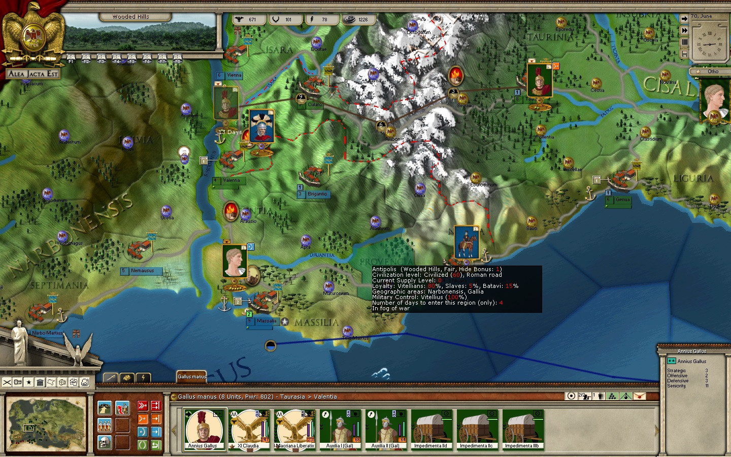 When the road opens back up over the Alps, I order Otho back to Cisalpine Gaul. The fucker marches on Massalia instead. What a maroon.
