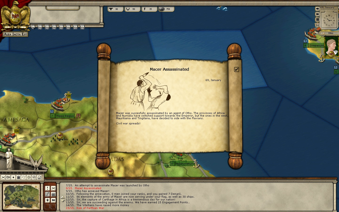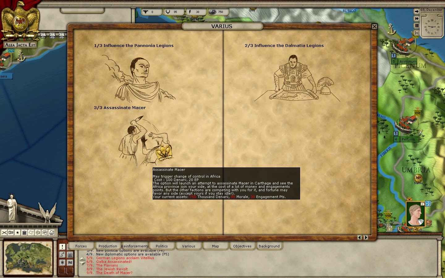 The Danube legions start out lost alreadt to Vespasian. I also don't have National Morale to unlock the Dalmatian or Pannonia legions. So let's try to assassinate Macer, who is in rebellion in Carthage: