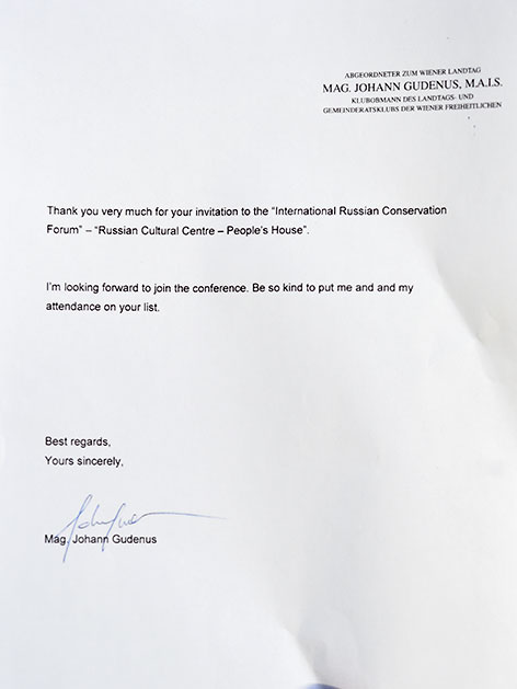 However, the Austria Press Agency (APA) reports that it has seen a letter from Gudenus from December, written in English with an official FPÖ letterhead, in which he thanked the IRCF for the invitation, and said he was "looking forward to join the conference".
